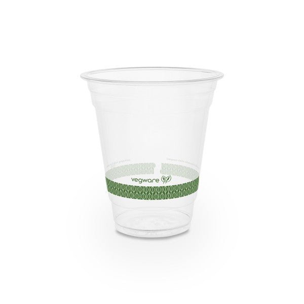 12oz PLA cold cup. Fits Vegware's 96-Series lids. For cold drinks, desserts, crudités, mini salads, or healthy snacks. Made from PLA, a renewable material made from plants. Clear for visibility with Vegware's iconic green band design. Award-winning quality by Vegware, made from plants. Designed for industrial composting.