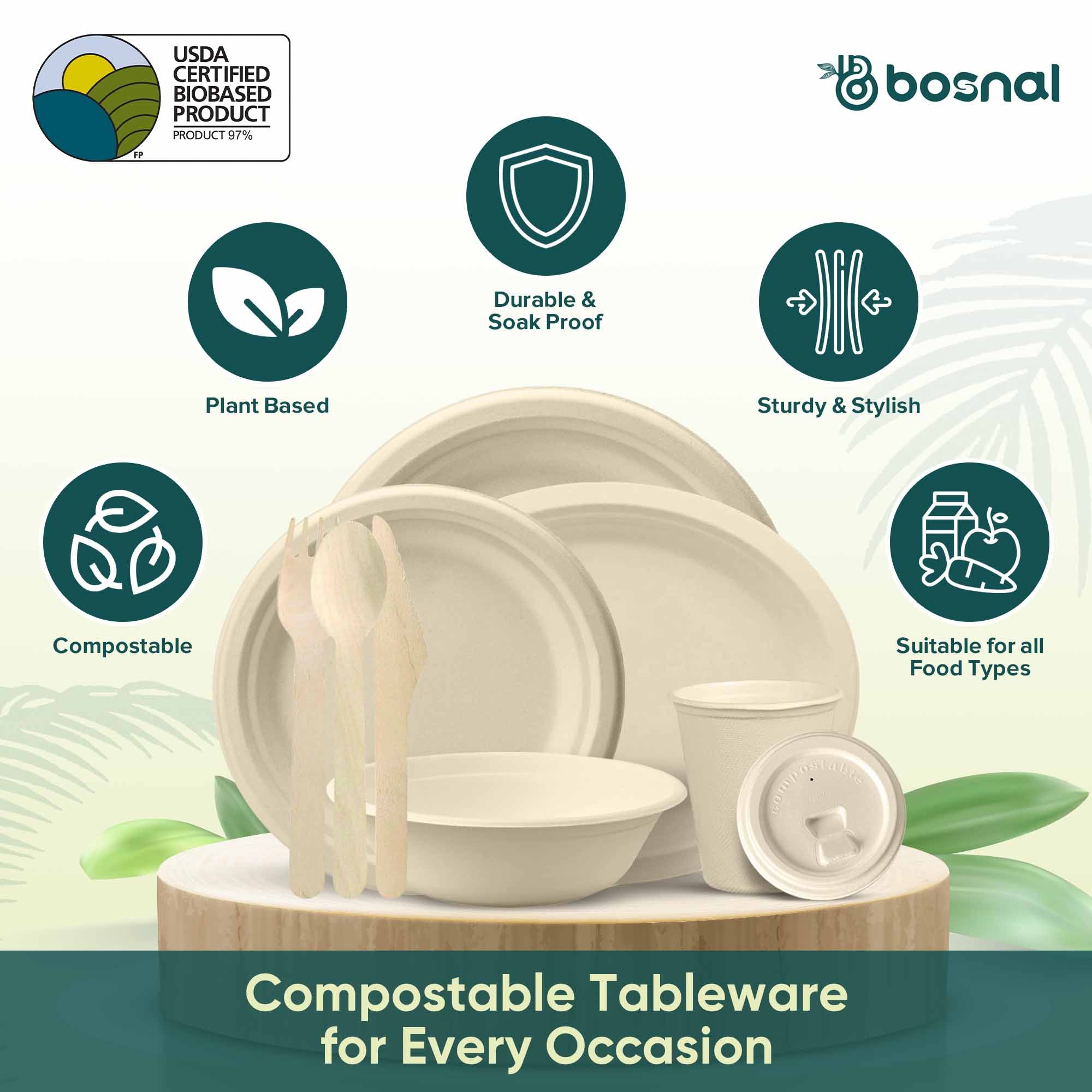 Serve meals responsibly with the BOSNAL 10 inch & 7 inch Round Plates, 10 inch Oval Plates, 32 oz Bowls, 8 oz Cups with Cutlery. Crafted from 100% plant-based sugarcane bagasse, this set is fully biodegradable and compostable, making it a sustainable choice for eco-conscious households, events and businesses.
