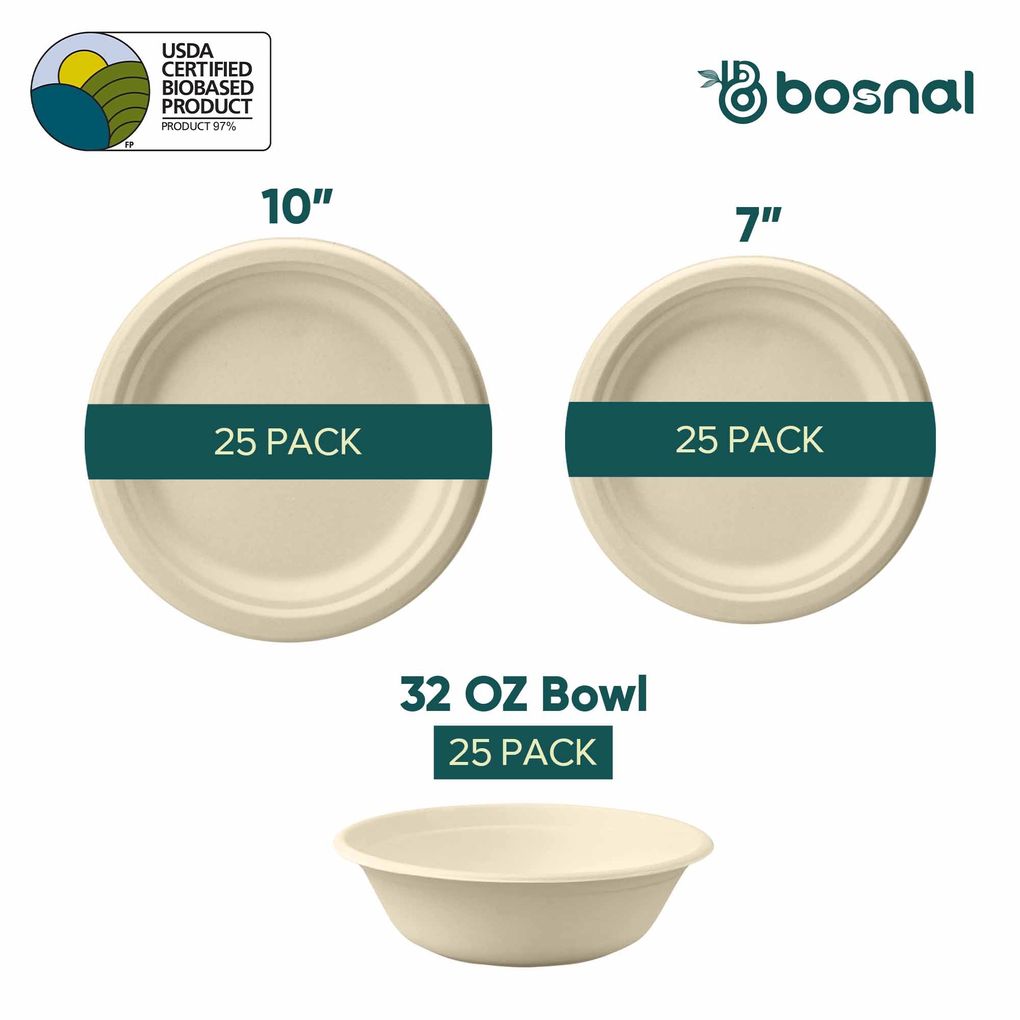Upgrade your dining experience with BOSNAL 10 inch & 7 inch Round Plates with 32 oz Bowls, crafted from 100% plant-based sugarcane bagasse. These sturdy, compostable and microwave-safe pieces offer a perfect blend of convenience and sustainability - ideal for serving hot or cold foods at home or events.