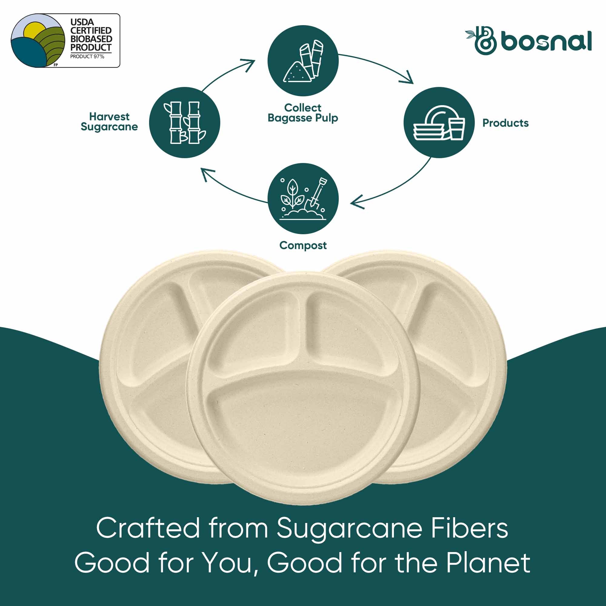 BOSNAL 10 Inch Round 3-Compartment Compostable Plates combine sustainability, convenience, and durability. Crafted from 100% reclaimed sugarcane fibers (bagasse), these eco-friendly plates are fully biodegradable and compostable - helping you serve meals responsibly while reducing environmental impact.