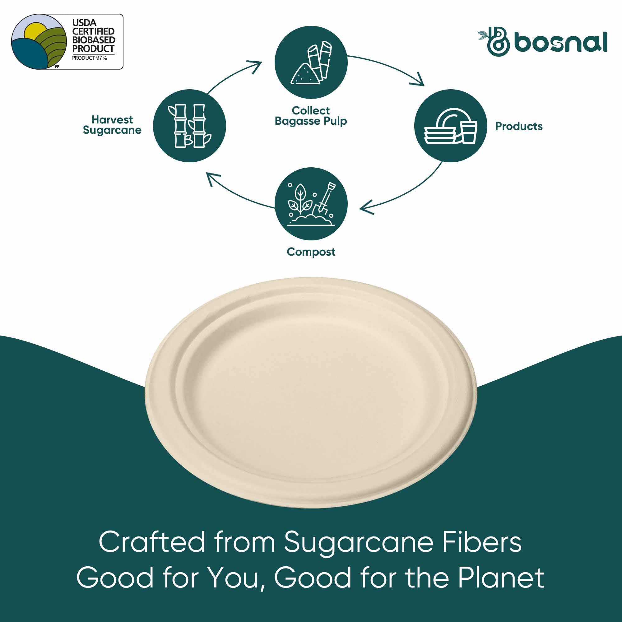 BOSNAL 7 Inch Compostable Round Plates combine practicality, sustainability, and style. Made from 100% reclaimed sugarcane fibers (bagasse), these eco-friendly plates are fully biodegradable and suitable for composting - helping you enjoy meals without harming the environment.From Plant to Product to PlanetOur plates are crafted from renewable sugarcane pulp, transforming agricultural byproducts into durable, stylish and eco-conscious dinnerware. After use, they naturally decompose into nutrient-rich soil, reducing landfill waste.Perfect for Snacks & Small MealsWhether serving small meals, appetizers, desserts, or salads, BOSNAL 7-inch plates are sturdy, microwave-safe, BPA-free and leak-resistant - providing a reliable, eco-friendly option for homes, parties, catering or events.