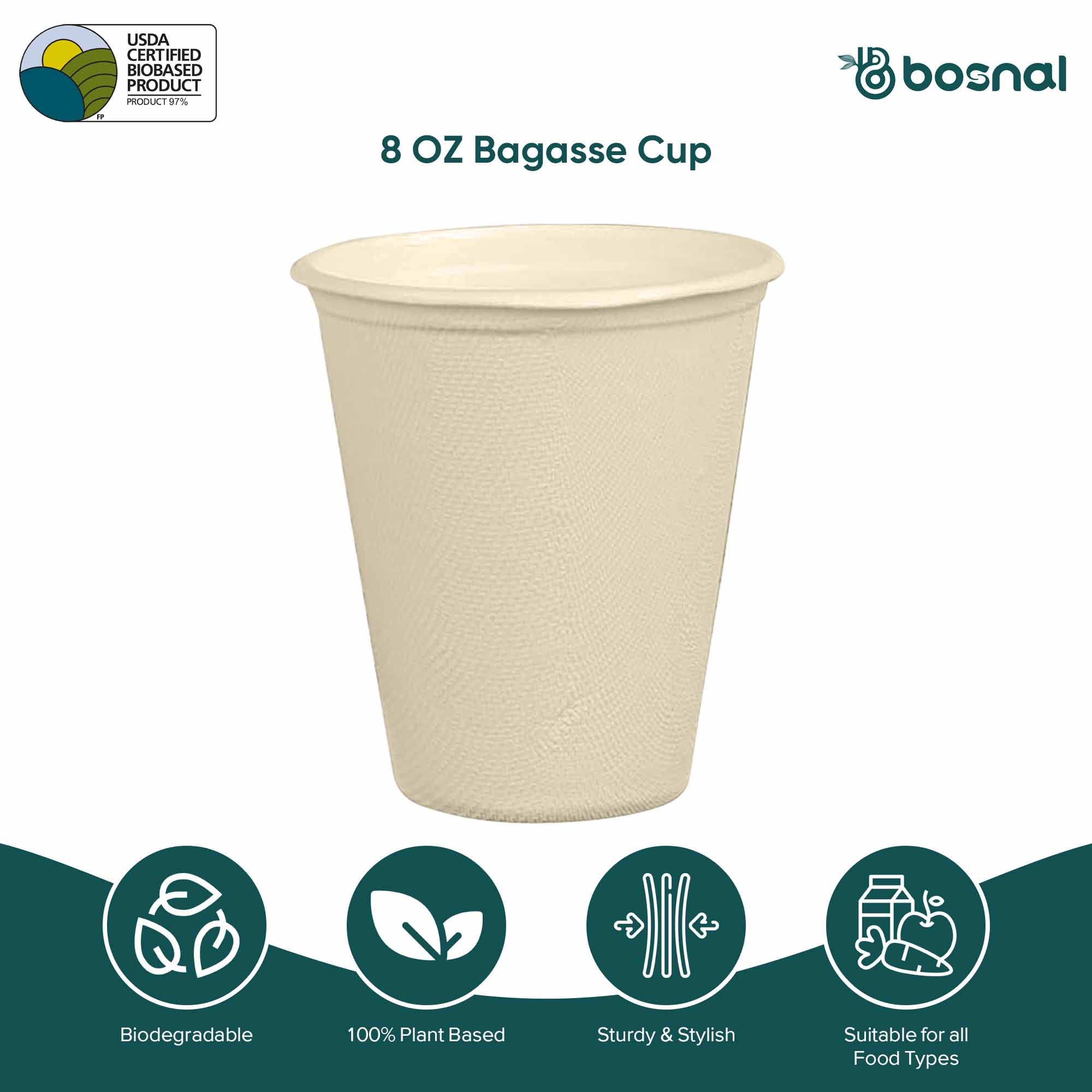 Enjoy Every Sip—Good for You, Good for the Planet Upgrade your beverage routine with BOSNAL 8 oz compostable cups with lids. Thoughtfully crafted for eco-conscious consumers, these disposable cups combine style, durability, and sustainability. Made from 100% natural sugarcane fibers (bagasse), they’re fully biodegradable and suitable for composting—making it easy to enjoy your drinks guilt-free. From Plant to Product to Planet Our cups are made from reclaimed sugarcane pulp, transforming agricultural waste into versatile, sturdy, and stylish cups. Once used, they naturally decompose into nutrient-rich soil, completing a sustainable cycle and reducing environmental impact. Durable Performance for Any Beverage Enjoy hot lattes, tea, or refreshing cold drinks without compromise. Each cup comes with a secure, compostable flip-top lid, and is microwave safe (cup only) and BPA-free. Strong, leak-resistant, and condensation-proof, BOSNAL cups are perfect for daily use, parties, events, or the office.