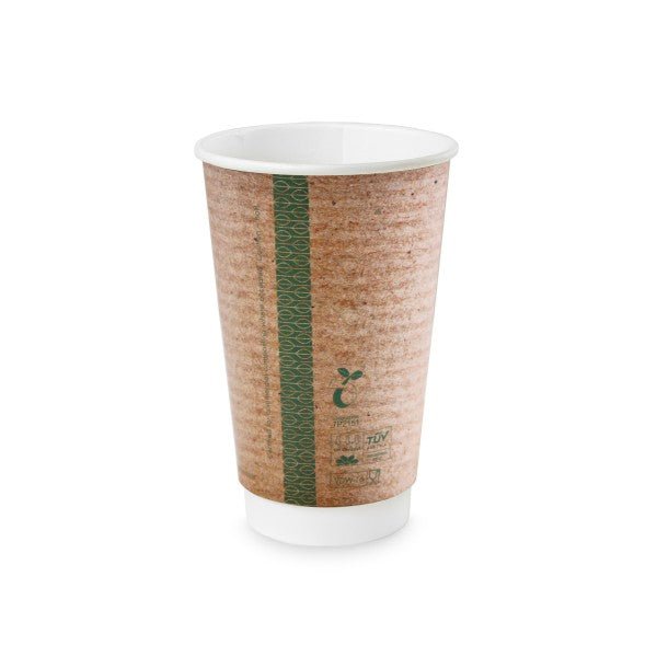 A Vegware icon. 16oz kraft double wall hot cup. Fits 89-Series lids. For coffee, tea and all hot drinks, or soup to go. A double wall of board, lined with plant-based, renewable, PLA. Brown kraft with Vegware's iconic green band. Award-winning quality by Vegware, made from plants. Designed for industrial composting.