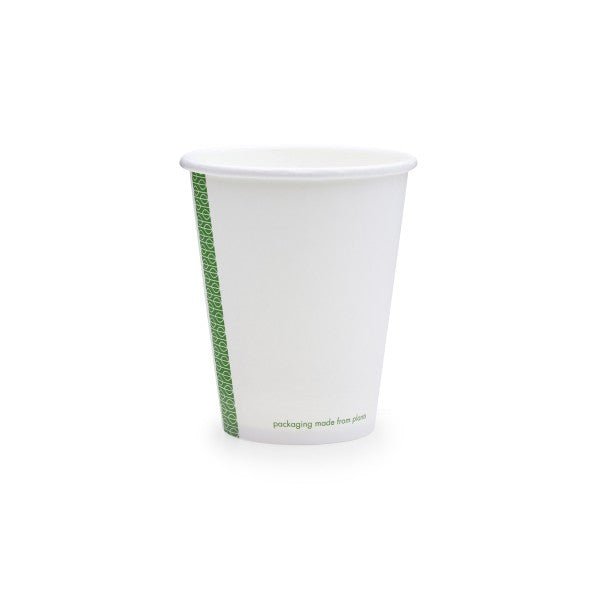 8oz white single wall hot cup. Fits Vegware's 79-Series lids. For coffee, tea and all hot drinks, or soup to go. Paperboard with a plant-based PLA lining. Crisp white with Vegware's iconic green band design. Award-winning quality by Vegware, packaging made from plants. Designed for industrial composting.
