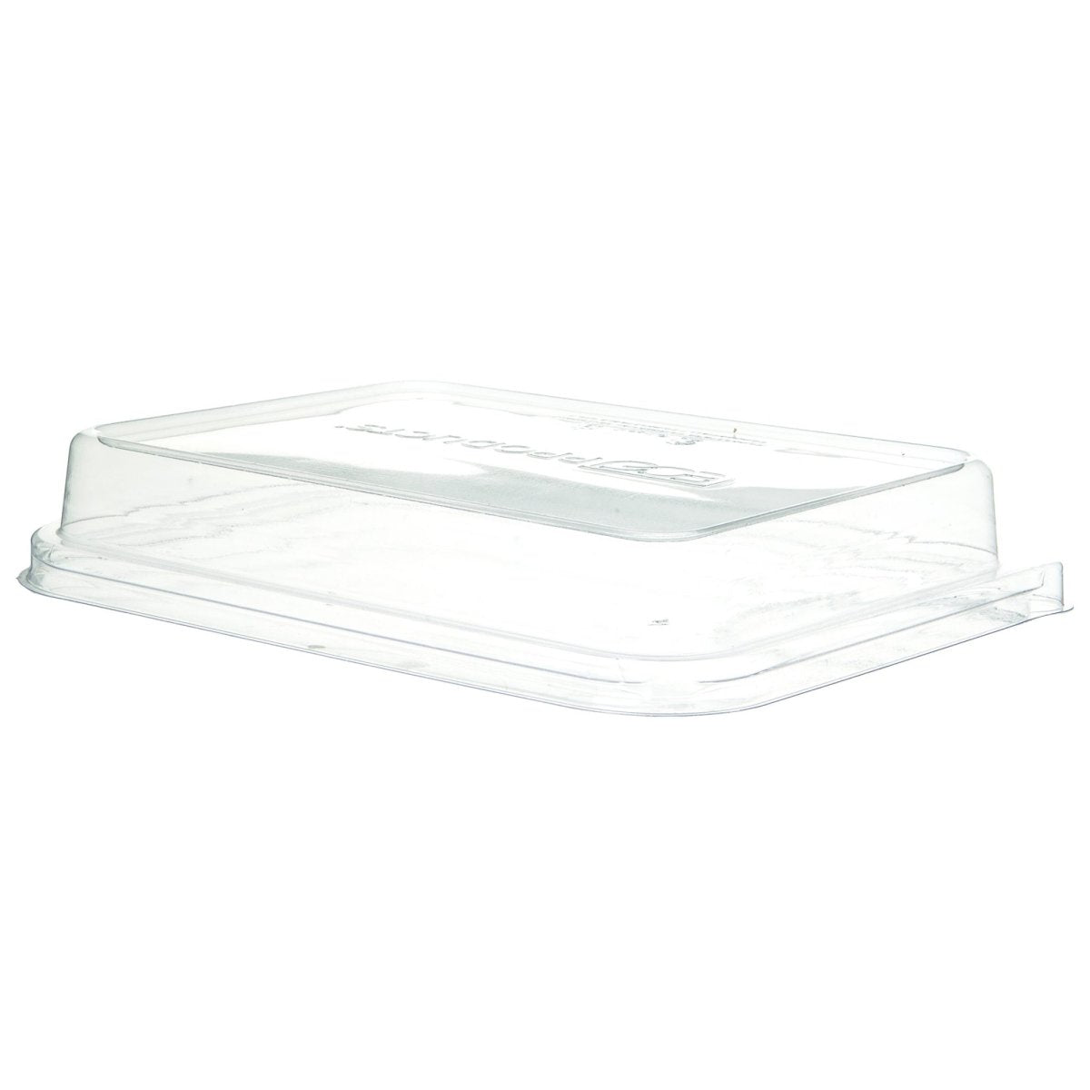 Wide and clear, renewable PLA lid for 8x6in 3-compartment World View Nacho Tray, for cold use only.