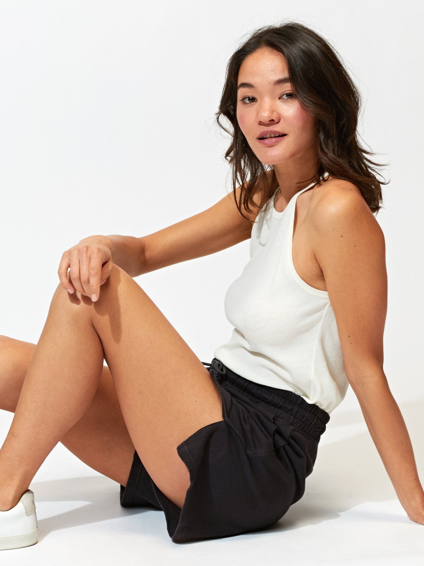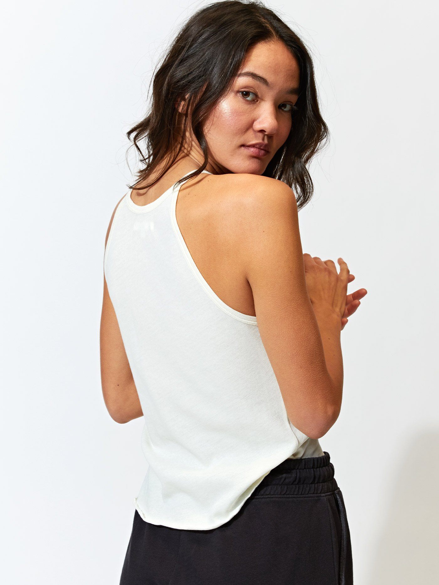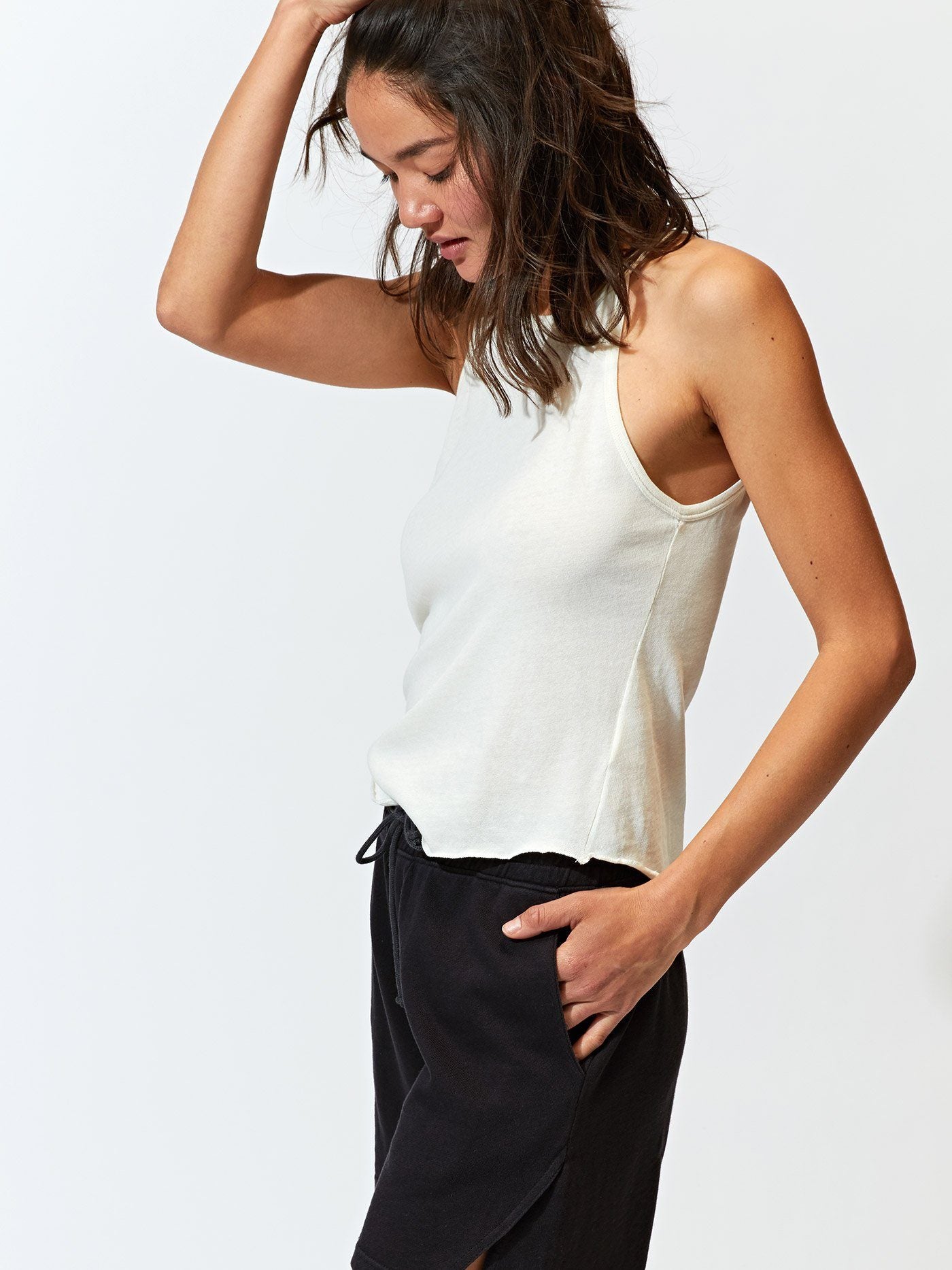 Let that sun shine on your shoulders in this 100% organic cotton Elpis Sweater Knit Tank with a high neckline and cutaway shape. Tuck it into shorts or jeans for a complete look.