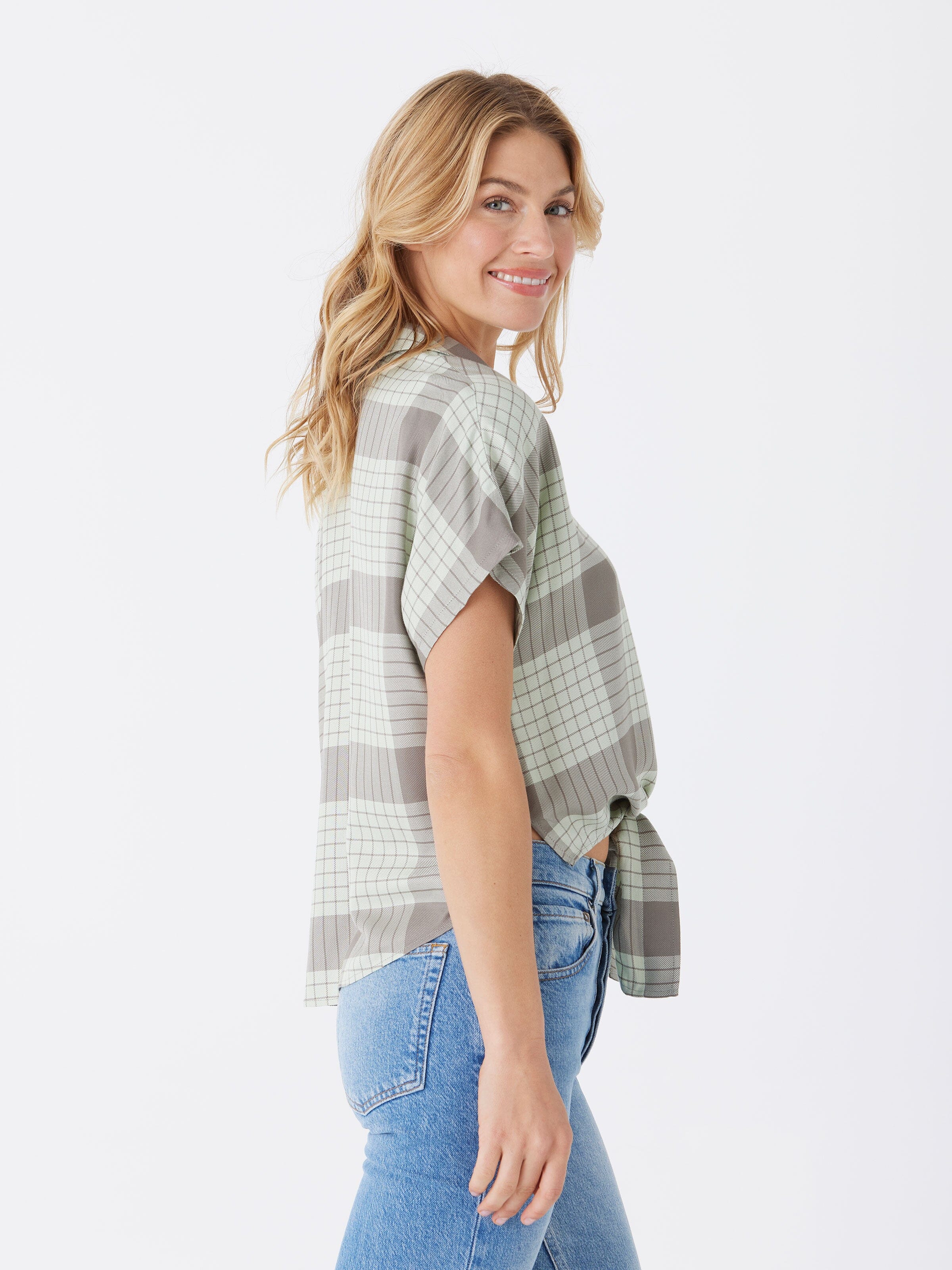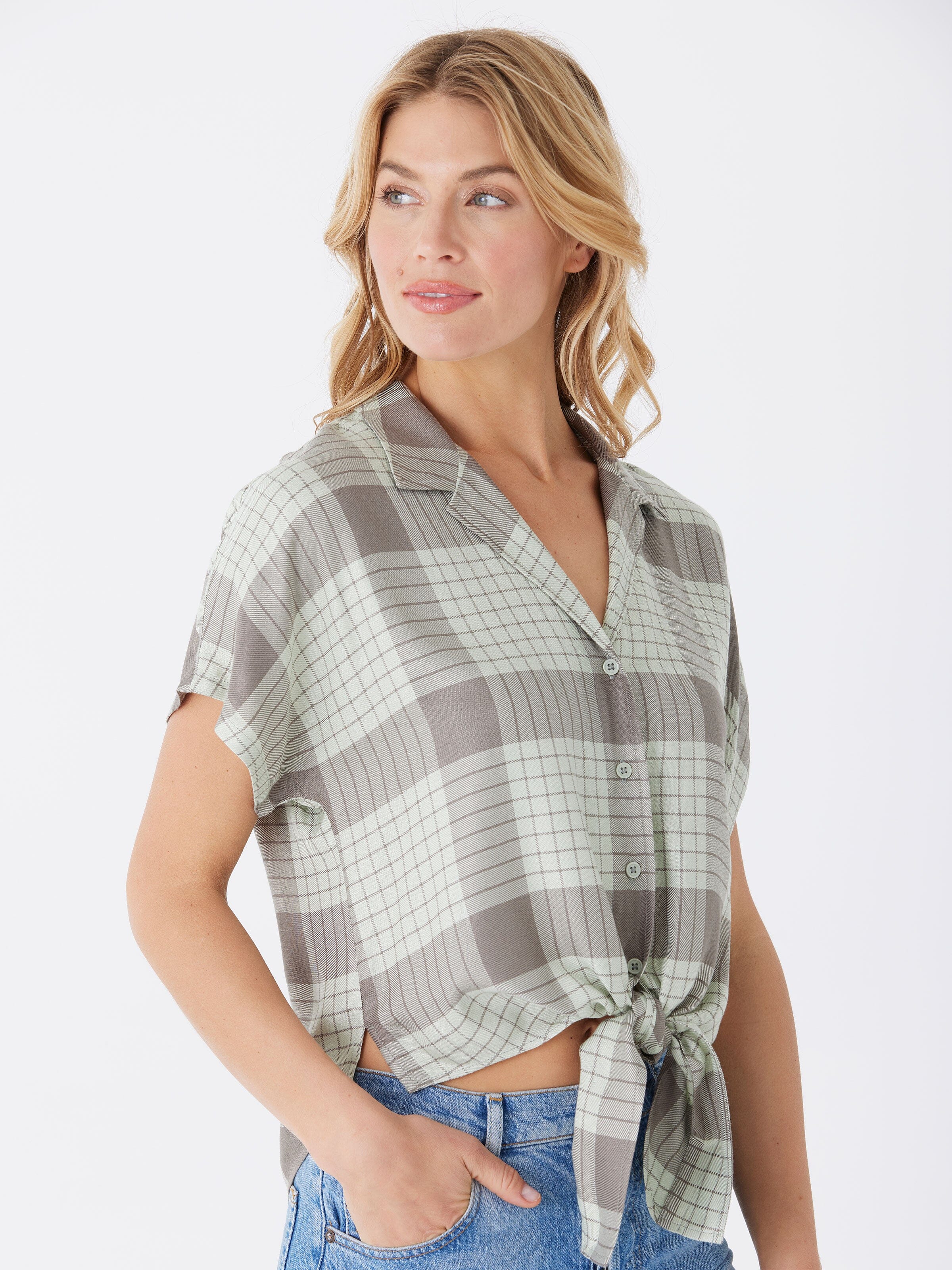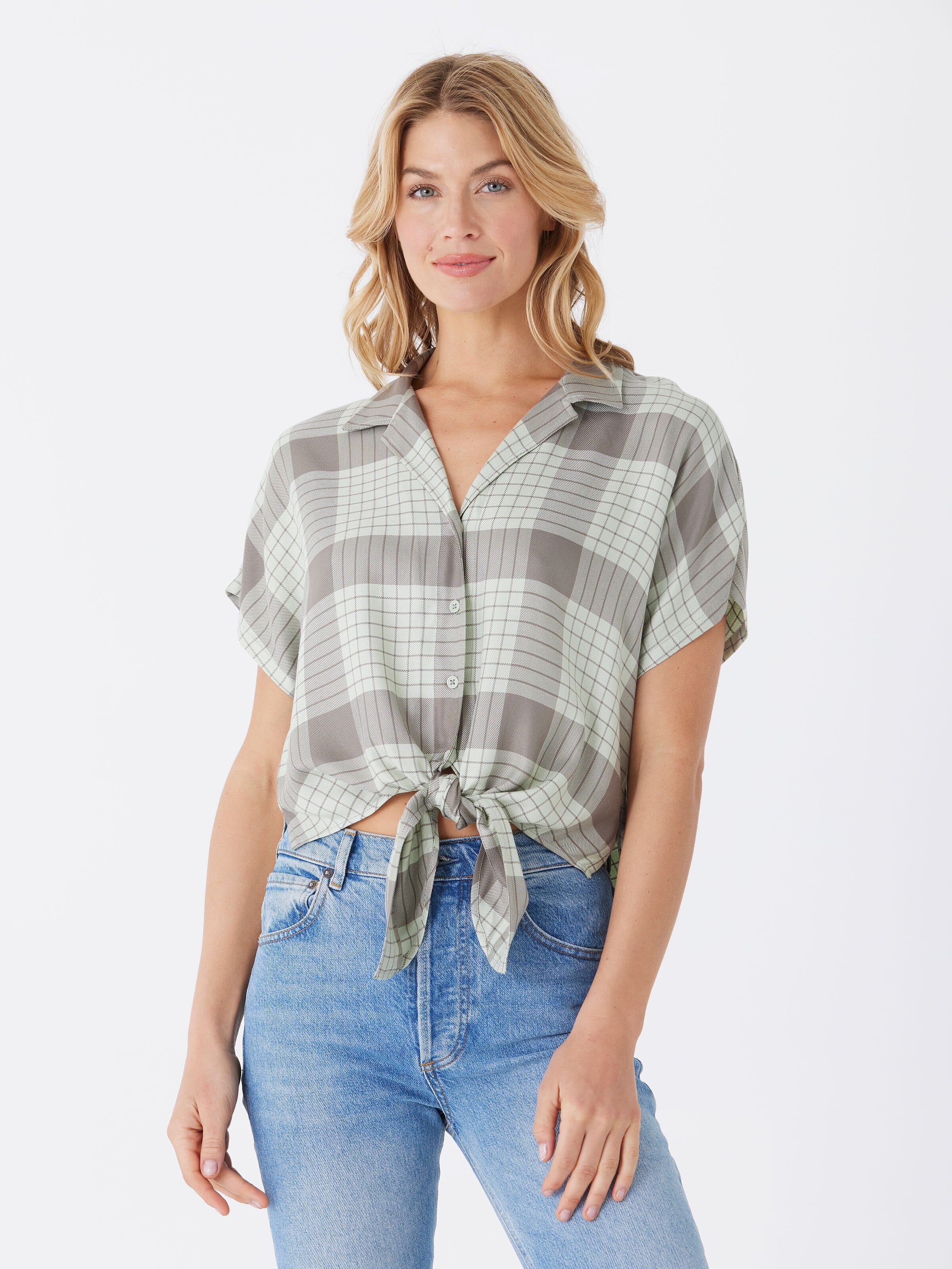 The Sheena Woven Button Up is crafted from 100% sustainable lenzing viscose for guilt-free fashion. It features a drop shoulder design and tie front detail, adding an elevated and stylish touch to any outfit.