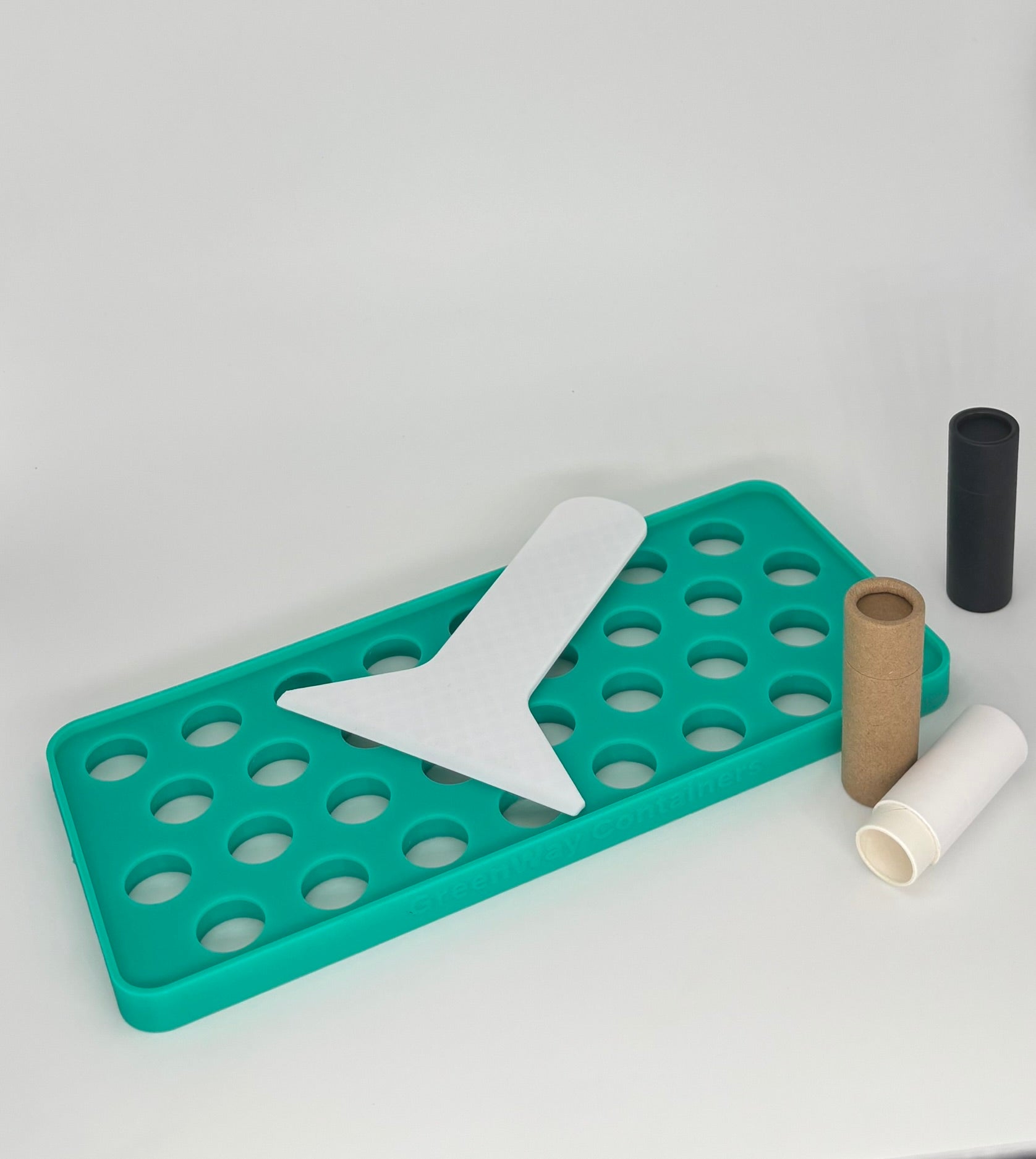 Pair your tubes with our 3D-printed silicone filling trays. You can fill up to 32 tubes at a time. The trays are food-grade, reusable, and dishwasher safe, making production fast and eco-friendly.