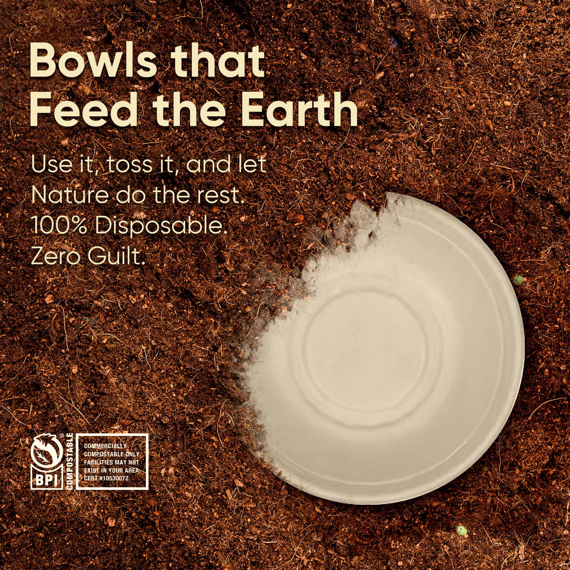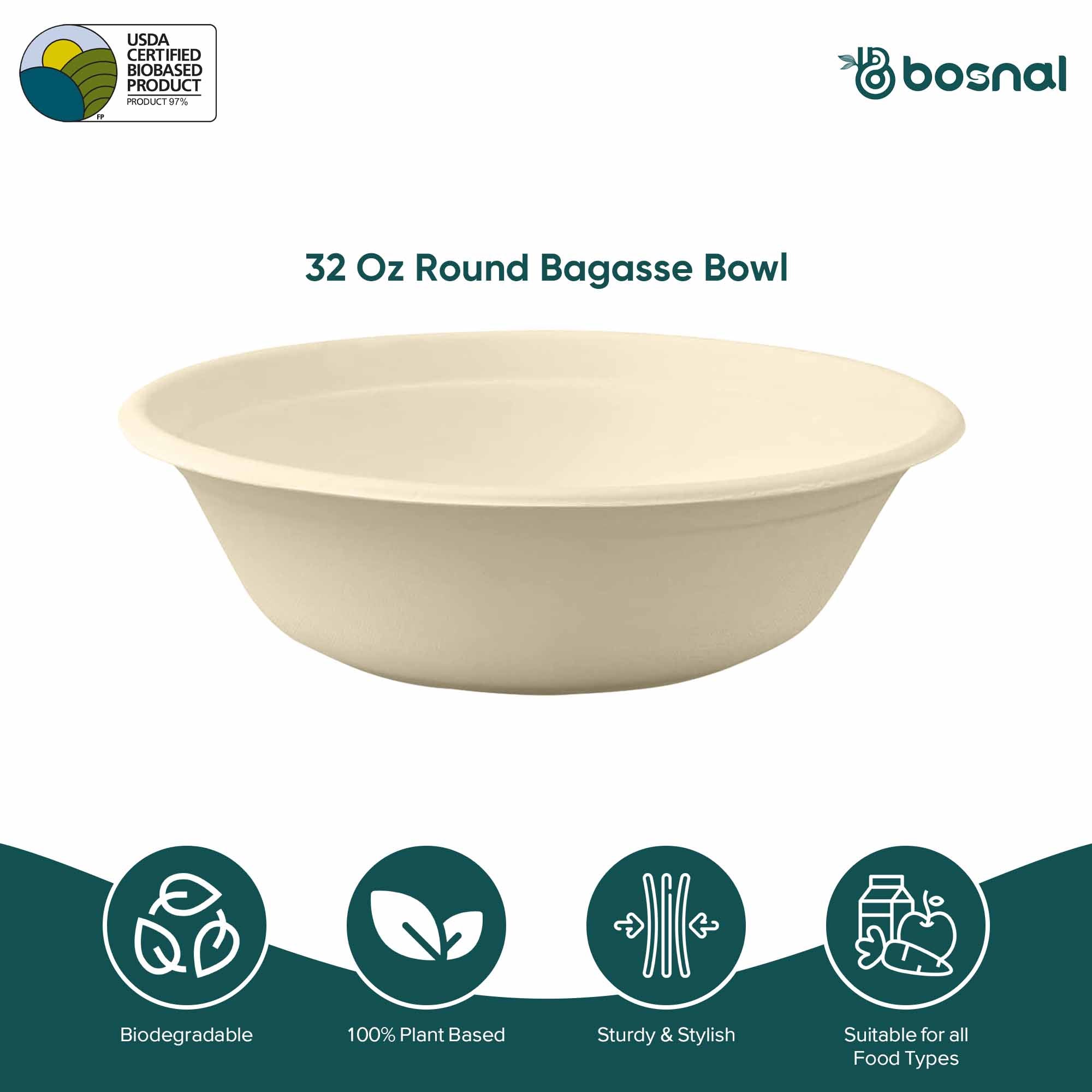 Bosnal - Sugarcane Bagasse Compostable 32 Oz Round Bowls - Case of 16 (400 Pcs)