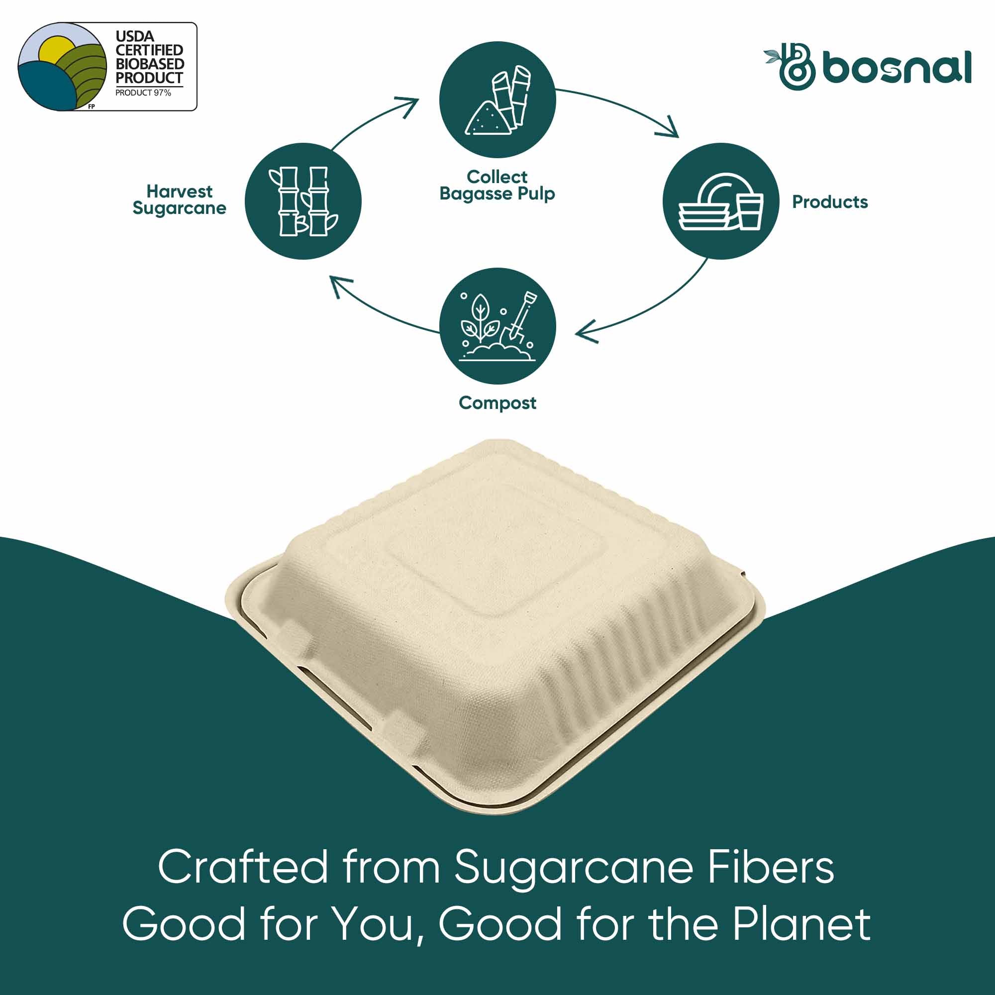 Upgrade your meal service with BOSNAL 9 Inch 3-Compartment Compostable Clamshells. Crafted from 100% reclaimed sugarcane fibers (bagasse), these eco-friendly containers are fully biodegradable and compostable - helping you serve meals sustainably while protecting the environment.
