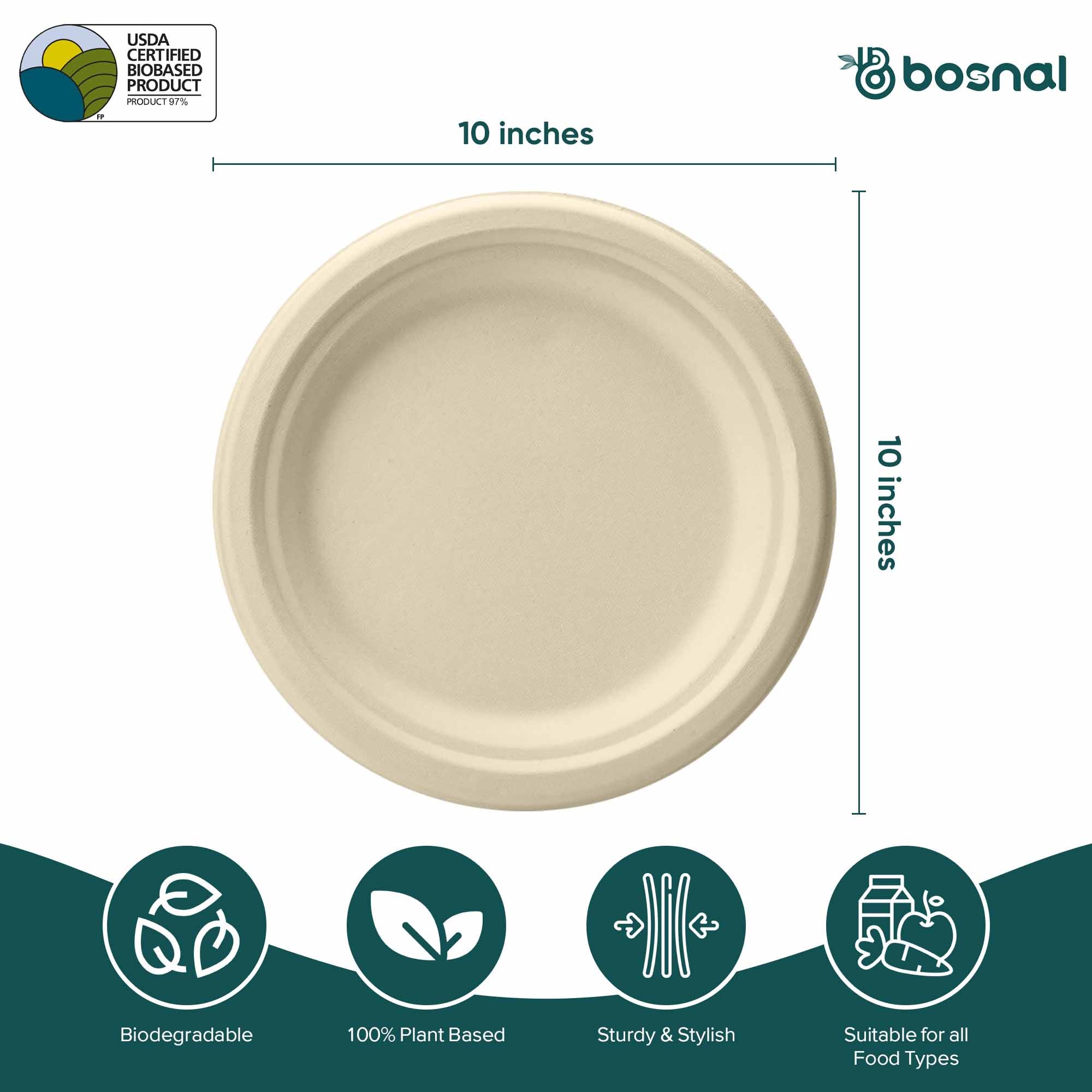 Serve Meals Responsibly with BOSNAL 10 Inch Round Plates Upgrade your tableware with BOSNAL 10 Inch Round Compostable Plates. Crafted from 100% reclaimed sugarcane fibers (bagasse), these eco-friendly plates are fully biodegradable and compostable, allowing you to enjoy meals responsibly while reducing environmental impact. From Plant to Product to Planet Made from renewable sugarcane pulp, each plate transforms agricultural byproducts into sturdy, functional, and eco-conscious dinnerware. After use, plates naturally decompose into nutrient-rich soil, completing a sustainable cycle. Durable, Safe, and Versatile These 10-inch plates are microwave-safe, BPA-free, and resistant to leaks and grease. Perfect for hot or cold meals at home, parties, events, or catering. Sturdy and reliable, they provide a convenient and eco-conscious dining solution.