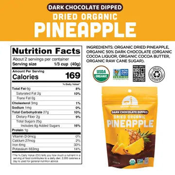Introducing our latest mouthwatering delight: Organic Dried Pineapple, Dipped in Dark Chocolate – a sweet sensation that's as guilt-free as it is indulgent. At Mavuno Harvest, we're committed to bringing you the finest, ethically sourced ingredients, and this product is no exception. Discover the Perfect Fusion of Flavors: Our Organic Dried Pineapple, Dipped in Dark Chocolate, combines the sun-kissed sweetness of ripe, organic pineapple slices with the rich, velvety embrace of premium dark chocolate. It's a harmonious blend of nature's finest ingredients, carefully crafted to satisfy your cravings while nourishing your body.