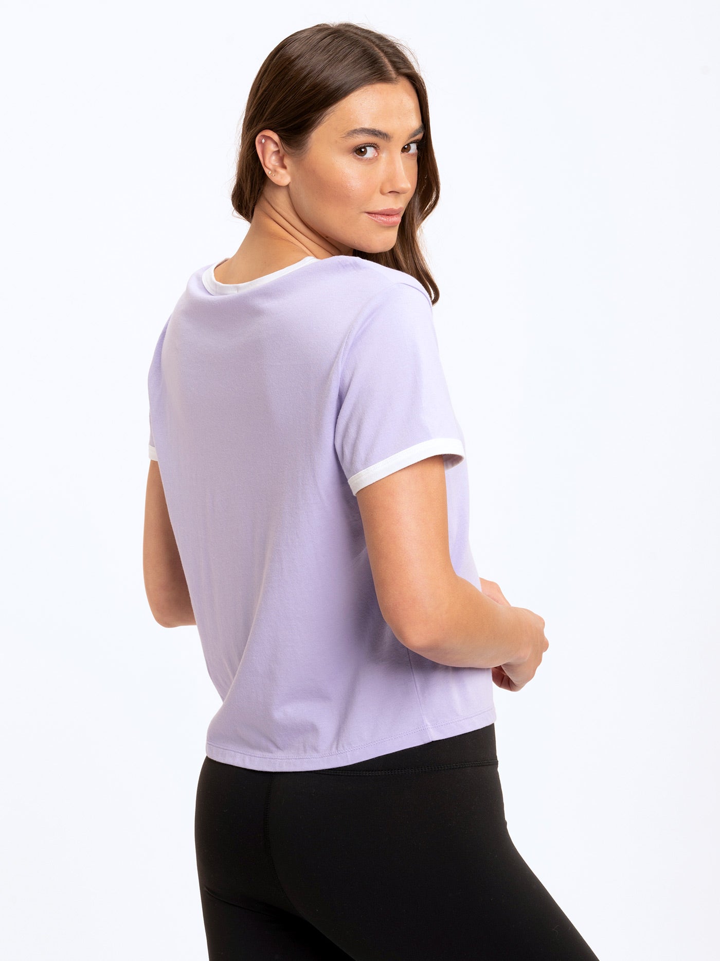 The Clea Crop Ringer Tee is made from our super soft blend of organic cotton and modal. This tee hits right at your high waist & is perfectly paired with your favorite leggings or skort!