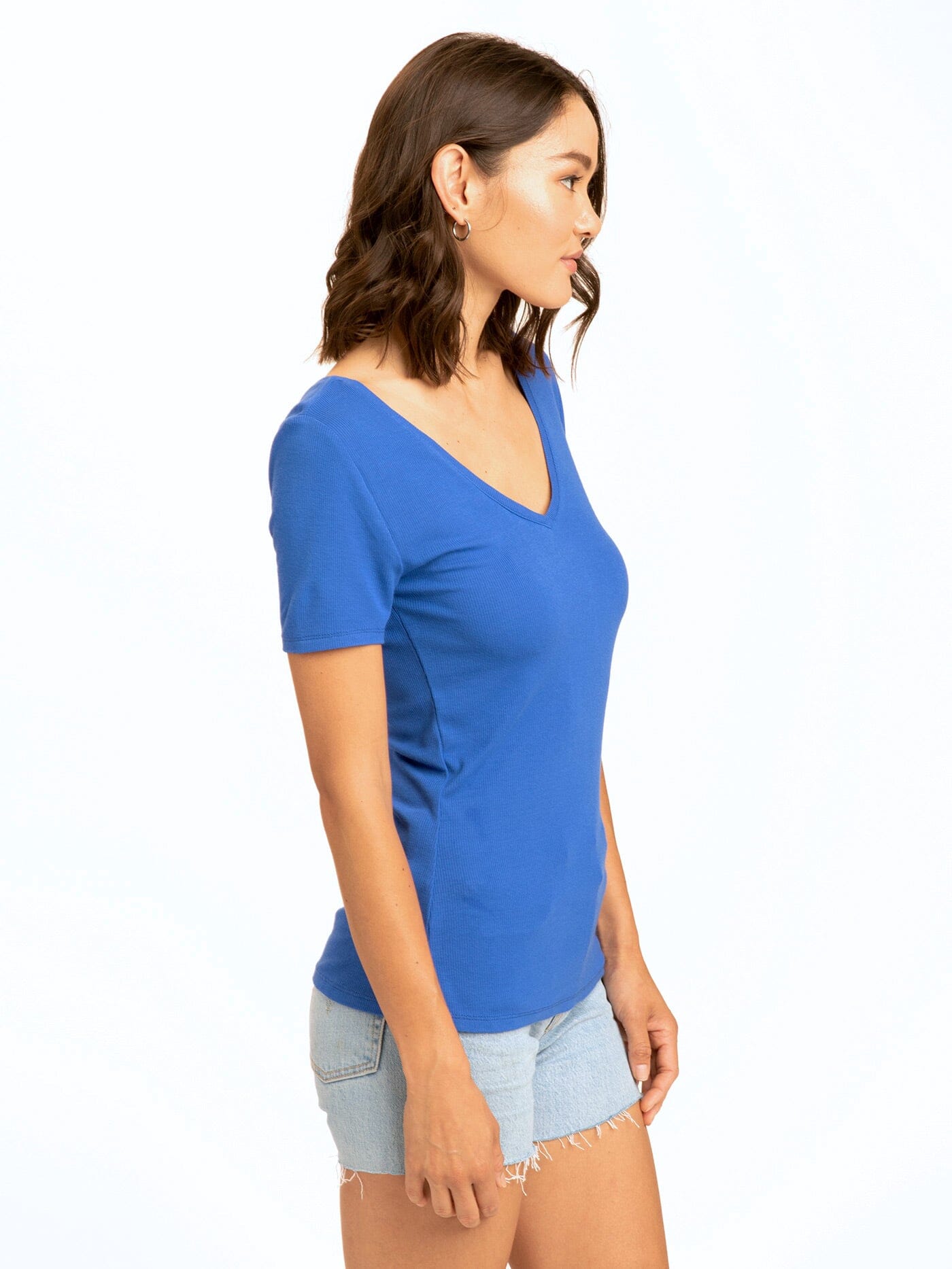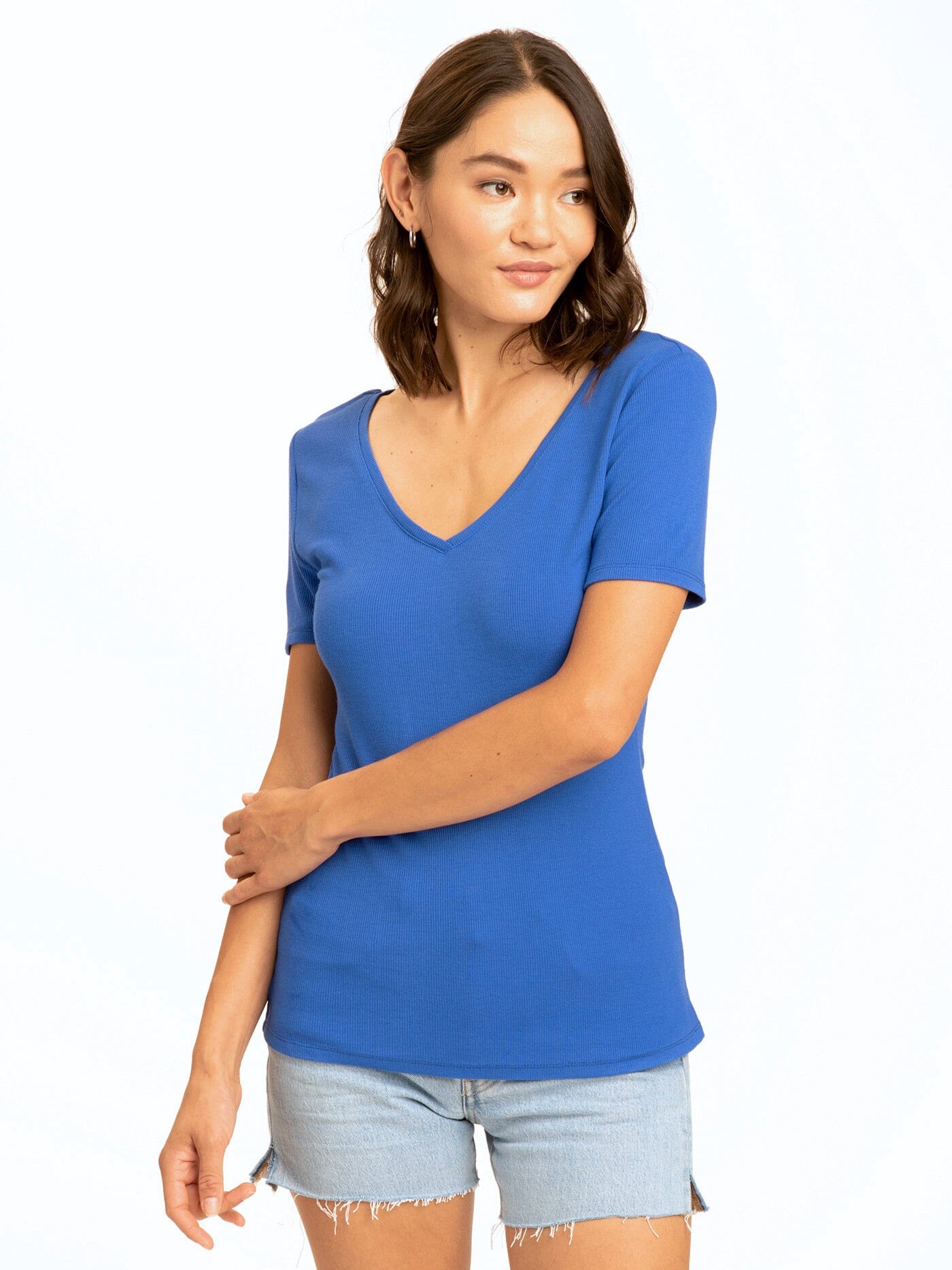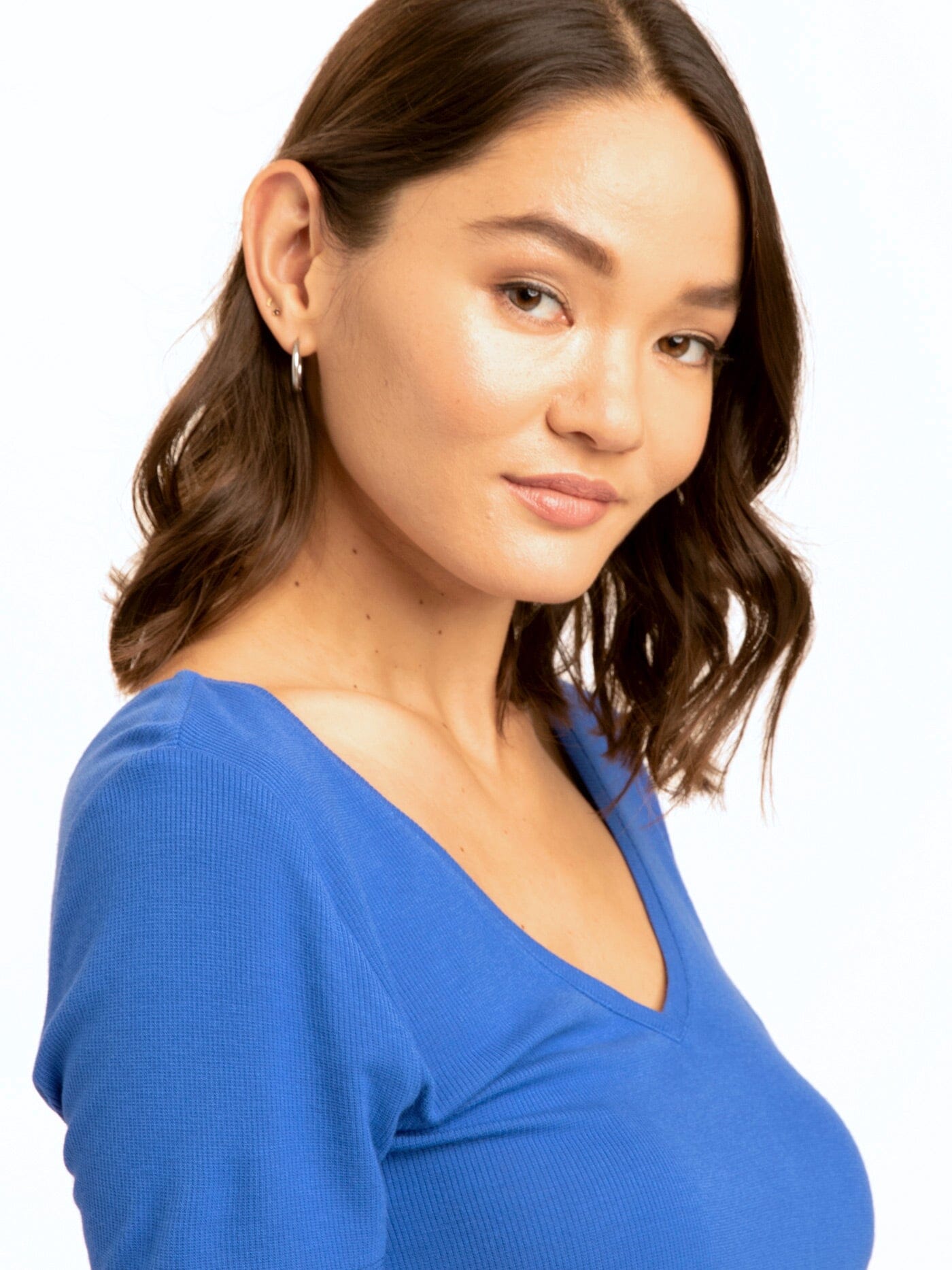 The Darina Feather Rib Top is a super soft and elevated wardrobe staple. Featuring a slim fit and double v-neck.