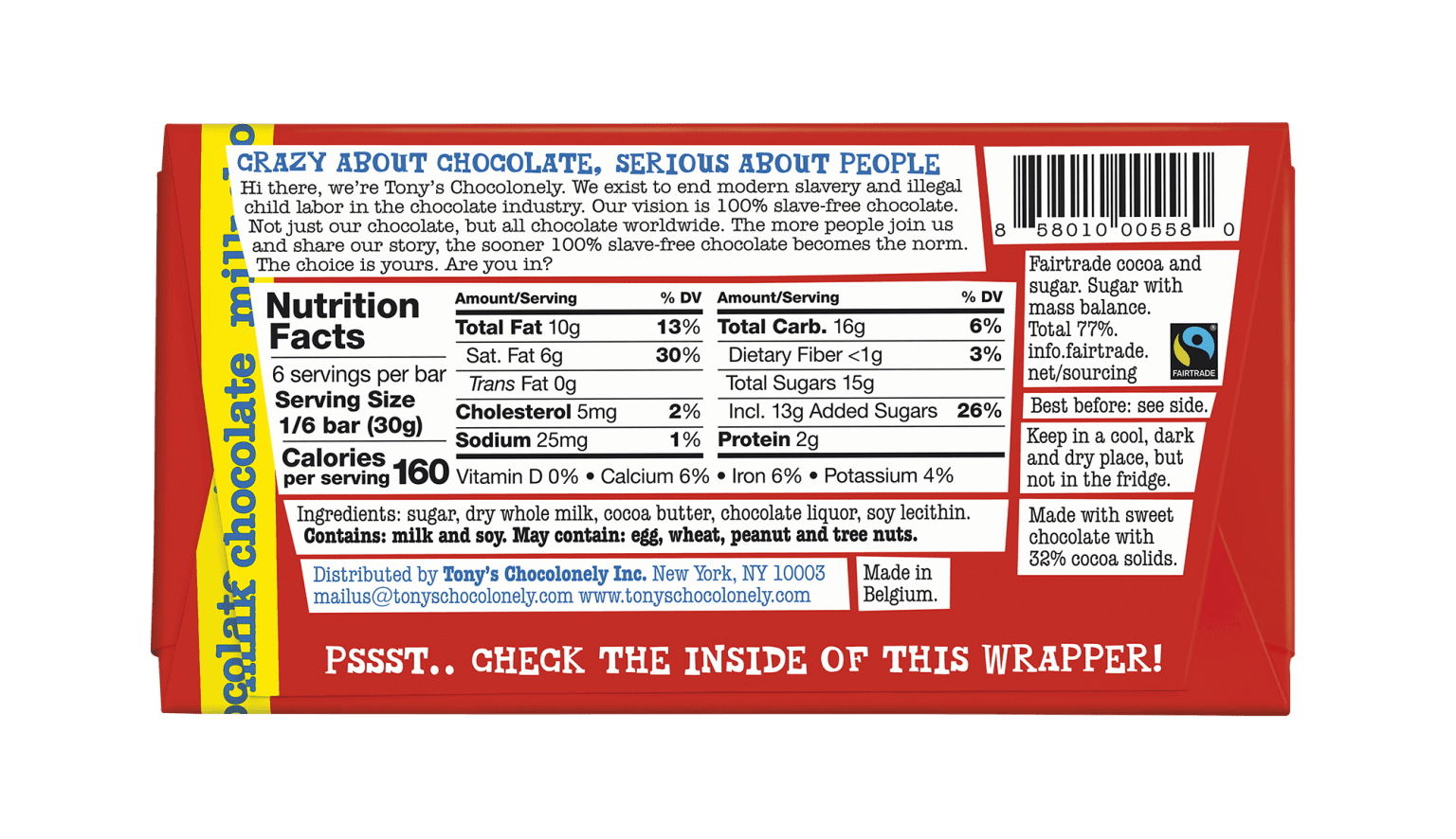 Not just a classic milk chocolate bar, but our classic chocolate bar. It was the first bar we ever made, back in 2005. We gave it a screaming red wrapper to attract attention to our main mission - 100% slave-free chocolate.