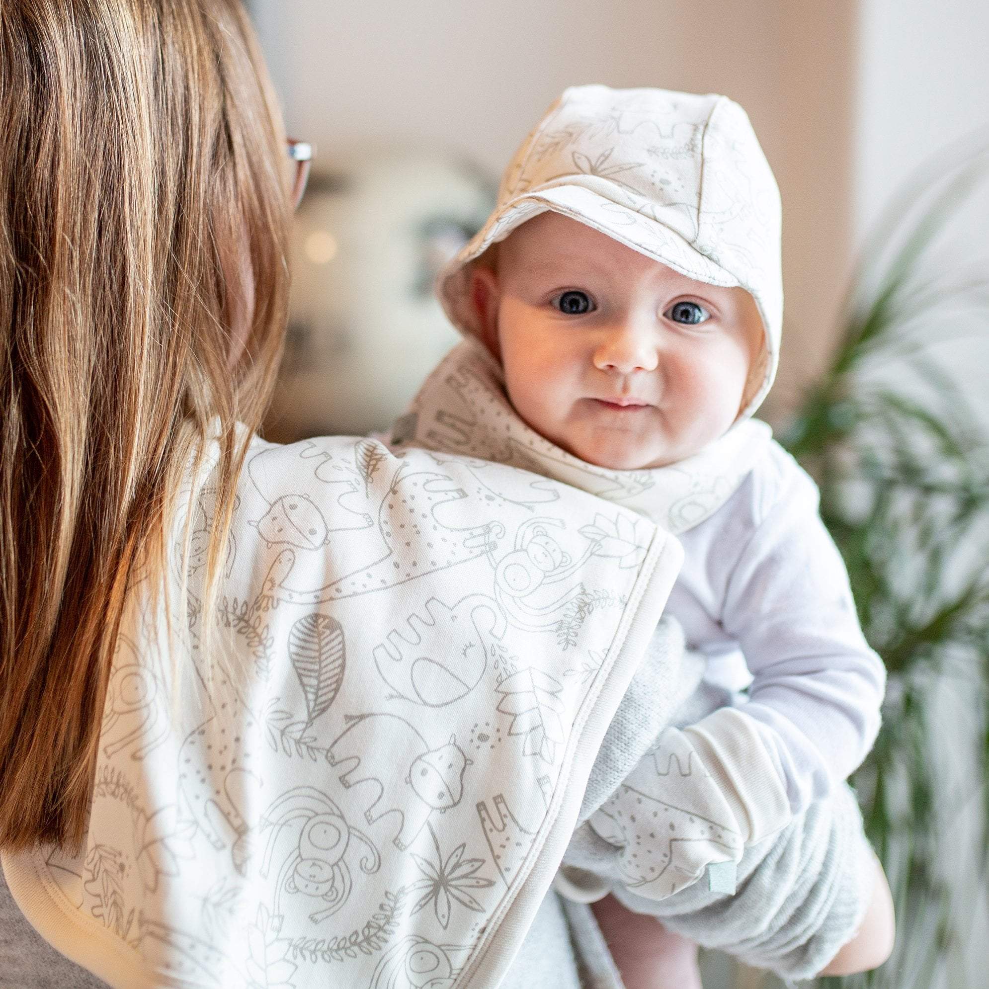 Our new pilot hat keeps baby's head warm, while also protecting it from the sun. It's a perfect two-in-one design and features whimsical jungle animals to boot! The hat is made from buttery-soft organic cotton, which is nice and gentle on baby's delicate scalp.