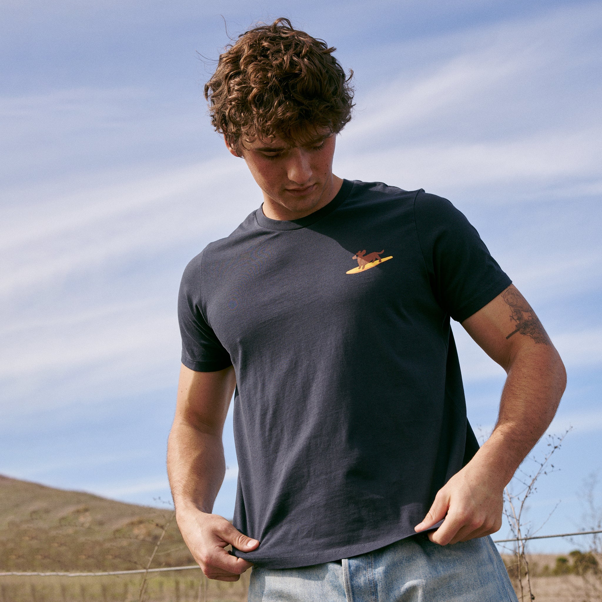 Surf’s pup! Catch some gnarly waves and some wag-worthy looks in this gray organic cotton surfing dog t-shirt; perfect for those who live life with a bit of salt in the air and fur on their clothes.