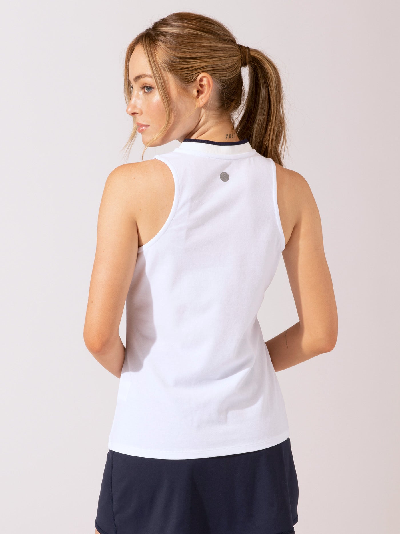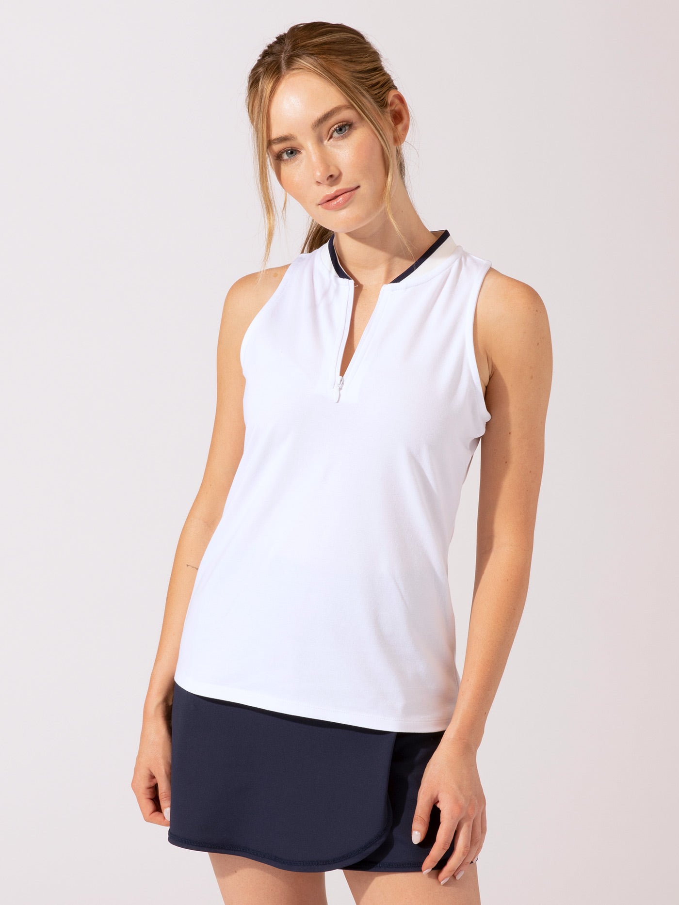 The Tiana Quarter Zip Tank is made from a stretchy, soft breathable active fabric that is designed to support your active lifestyle. This tank features a zip front and a color detail on the collar.