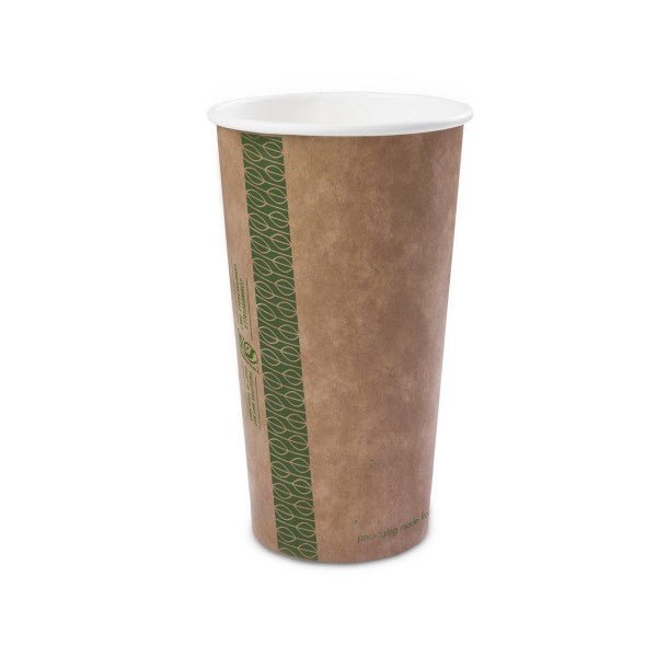 20oz kraft single wall hot cup. Fits Vegware's 89-Series lids. For coffee, tea and all hot drinks, or soup to go. Paperboard with a plant-based PLA lining.Brown kraft with Vegware's iconic green band. Award-winning quality by Vegware, packaging made from plants. Designed for industrial composting.