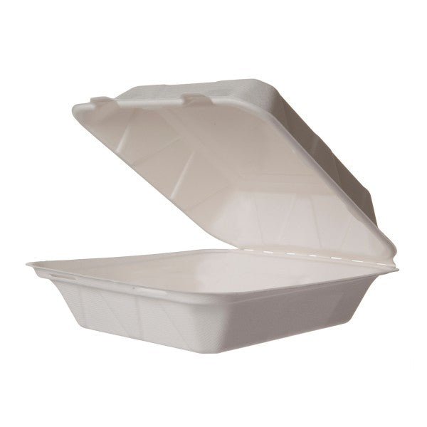 8in heavyweight molded fiber clamshell. For cold or hot food - street food, fried rice, salads, or even sweet treats. Made from reclaimed natural fiber, a material with great thermal properties. White. Award-winning quality by Vegware, made from plants. Designed for industrial composting.