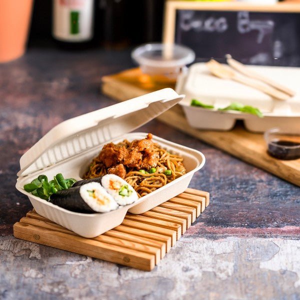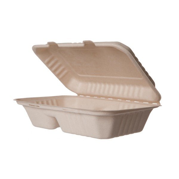 9 x 6in 2-compartment molded fiber clamshell. For cold or hot food - street food, fried rice, salads, or even sweet treats.Made from reclaimed natural fiber. Natural oatmeal color. Award-winning quality by Vegware, packaging made from plants. Designed for industrial composting.