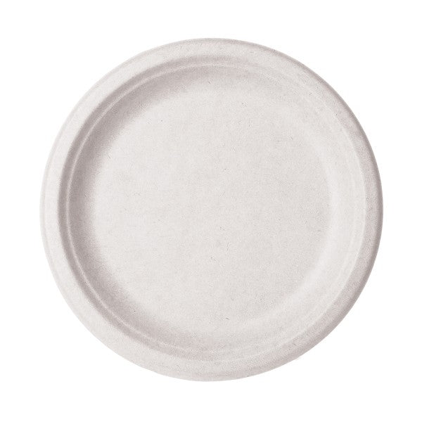 9in molded fiber plate. Great for hot or cold use, and sturdy enough to load up with food. Made from reclaimed natural fiber, a material with great thermal properties. White. Award-winning quality by Vegware, made from plants. Designed for industrial composting.